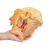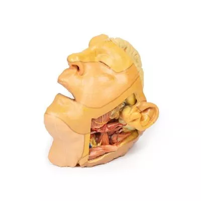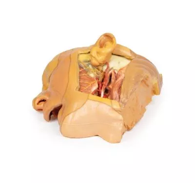 این مدل سهبعدی چاپشده نمای بسیار دقیق و آموزشی از کلیه ساختارهای مهم سر و گردن را ارائه میدهد. در نمای جانبی صورت، پنجرهای روی ناحیه پاروتید (غده بزاقی) باز شده است تا ساختارهایی که معمولاً توسط آن پنهان میشوند — مثل پشت عضله دیگاستریک (digastric)، ماستر (masseter) و کندیل فک پایین در TMJ — دیده شوند. عضله استرنوکلوئیدوماستوئید (SCM) بازتاب داده شده تا فرآیند ماستوئید نمایان شود و گوش خارجی (pinna) در جای خود حفظ شده است.