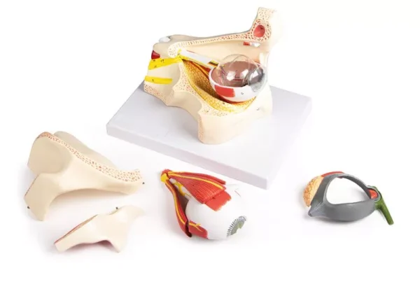 این مدل شامل ۱۳ قسمت قابل جداشدن است که هرکدام بخش مهمی از آناتومی چشم را نشان میدهند: چشمپلک با غده اشکی و مجرای اشکی، عضلات خارجی چشم (۴ قسمت)، گلچشم (گلوب چشم) که در دو نیمه تفکیک میشود، و بخشهای داخلی چشم شامل قرنیه، عنبیه، عدسی و جسم زجاجی در سه بخش مجزا. همهی این قطعات روی پایهای قابل جابجایی سوار شدهاند تا نمایش و آموزش را راحتتر کنند.