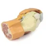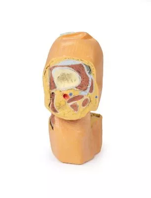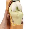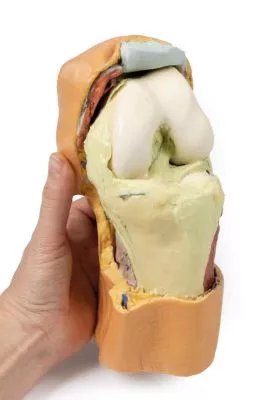 این مدل آناتومیک ۳D چاپشده نمای عمقی و دقیق مفصل زانو چپ در حالت خمیده را نشان میدهد. در بخش فوقانی، بخشهایی از عضلات کوآدریسپ femoris و سارتوریوس همراه با ترکتوس ایلیوتیبیال قابل مشاهدهاند. حفره پوپلیتئال (popliteal fossa) شامل عروق پوپلیتئال، عصب تیبیال و عصب پرونئال مشترک است. بخش خلفی شامل عضلات پشت ران مثل بایسپس فموریس، سِمیتِندِینوس و سِمِیمِمبرانوس و اتصالات آنها به استخوانهاست. در بخش پایینی، عضلات بخشهای قدامی، جانبی و خلفی ساق همراه با عروق و اعصاب مهم مانند شریان تیبیال قدامی و عصب پرونئال عمقی و شریان تیبیال خلفی و عصب تیبیال قابل مشاهدهاند. در قسمت قدامی، بخشی از تاندون کوآدریسپ و لیگامان پاتلار حفظ شده و رباطهای صلیبی قدامی و خلفی بههمراه منیسکهای جانبی و میانی بین استخوان فمور و تیبیا دیده میشوند.